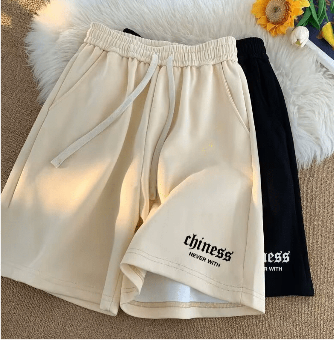 Designed for everyday versatility, these shorts feature a relaxed loose fit, an elastic waistband with an adjustable drawstring for a personalized fit, and a statement script embroidery that adds a distinctive edge.